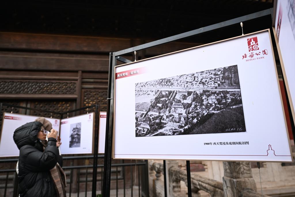 1月22日,参加琉璃阁院落腾退移交仪式的人员在北海公园“西天梵境”观看其历史照片展。