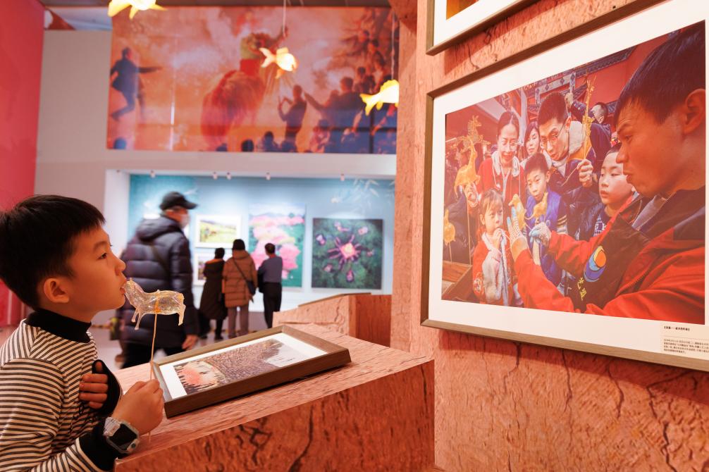 1月26日,在中国非物质文化遗产馆举行的展览现场,小朋友被一幅摄影作品吸引。
