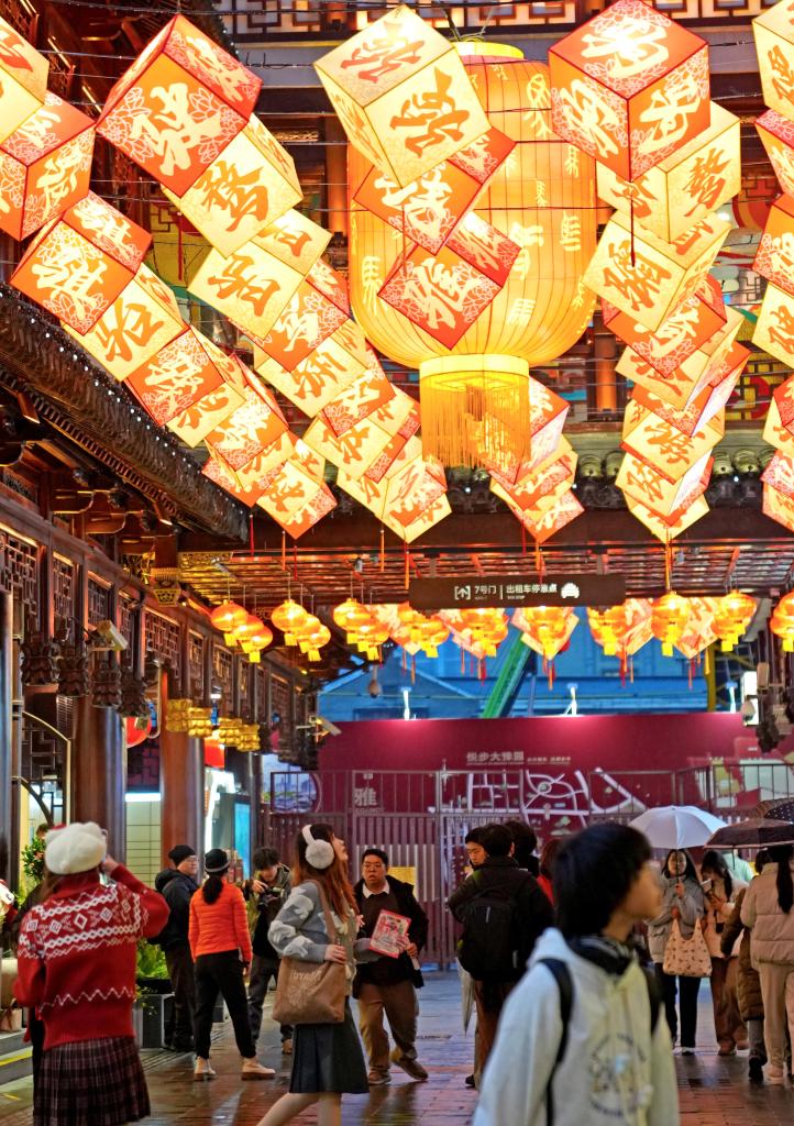 1月26日,在豫园商城中心广场上,游客在马年主题灯组“骏驰九州,步步生花”前驻足。