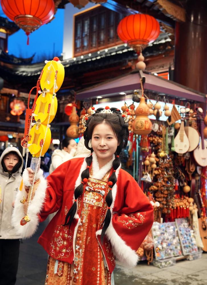 1月26日,一名女士身着传统服饰逛豫园灯会。