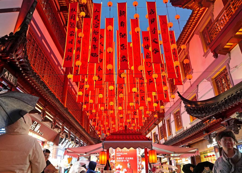 1月26日,豫园灯会上的春联与流光溢彩的花灯营造出新春的喜庆氛围。