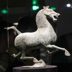 20世纪60年代,甘肃省武威市雷台汉墓出土了这匹蹄掠飞隼、腾空疾驰的青铜马。与铜奔马一起出土的还有一支由28匹马、1头牛、13辆马车、1辆牛车、17个持矛戟武士、28个奴婢组成的铜车马仪仗俑队列,气势恢弘。