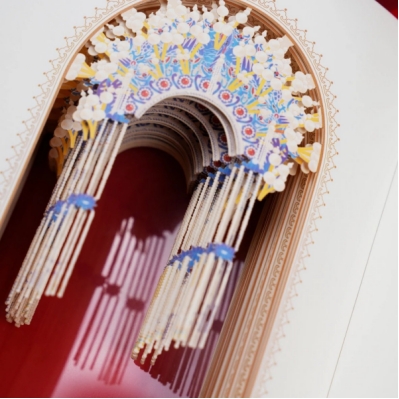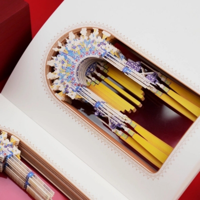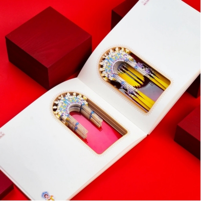 纸雕本采用双面透明的设计,360度展现凤冠之璀璨绮丽,可以从不同的角度欣赏到凤冠的每一个细节。从红色底到金色底的切换,如同旦角在舞台上完成了一次华丽的行头变换,不仅增加了纸雕的艺术价值,更增添动手的乐趣在翻阅的过程中感受传统文化的独特魅力。