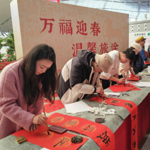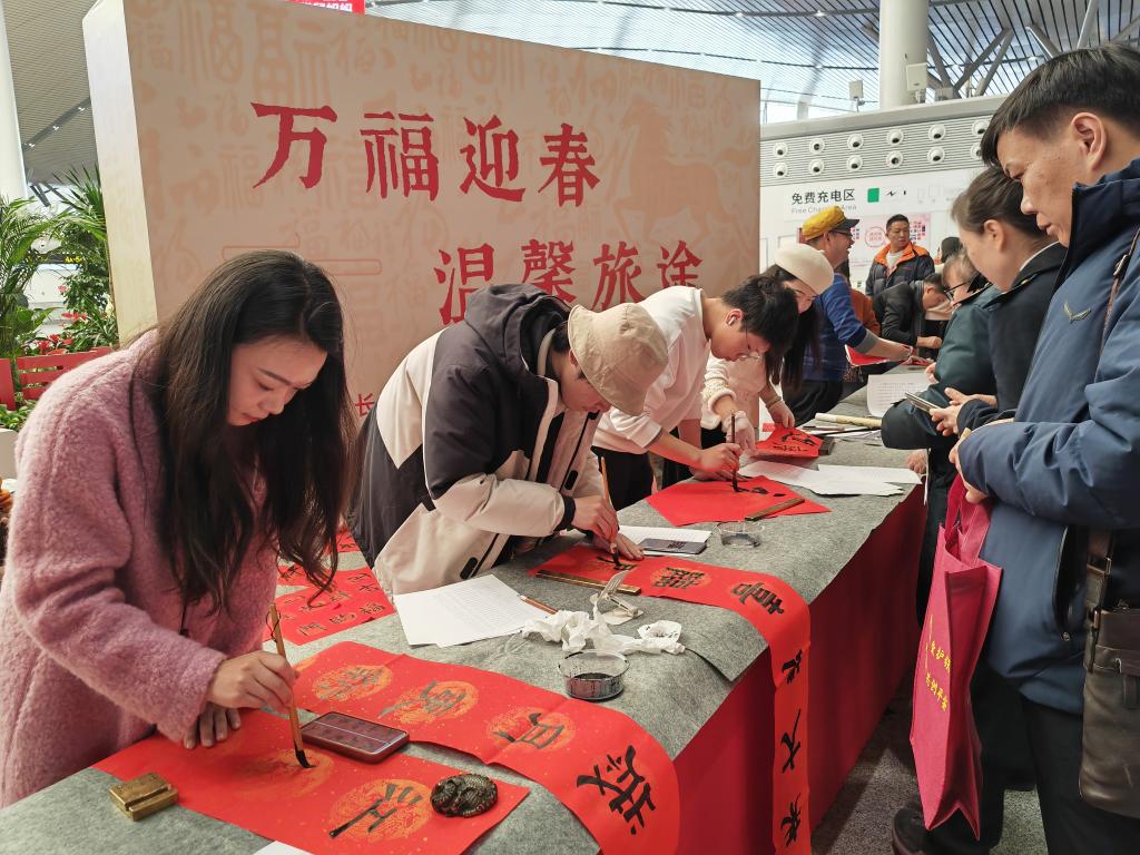 除了精彩的巡演,长沙南站还举办了猜谜语互动、写春联送祝福等特色文化活动。湖南省文化馆副馆长曹隽平介绍,他和20余名文化志愿者挥毫泼墨,当天一共送出千余张福字和春联。“手写的春联还带着墨香,这才是过年的味道!”一位接过春联的旅客笑着说。