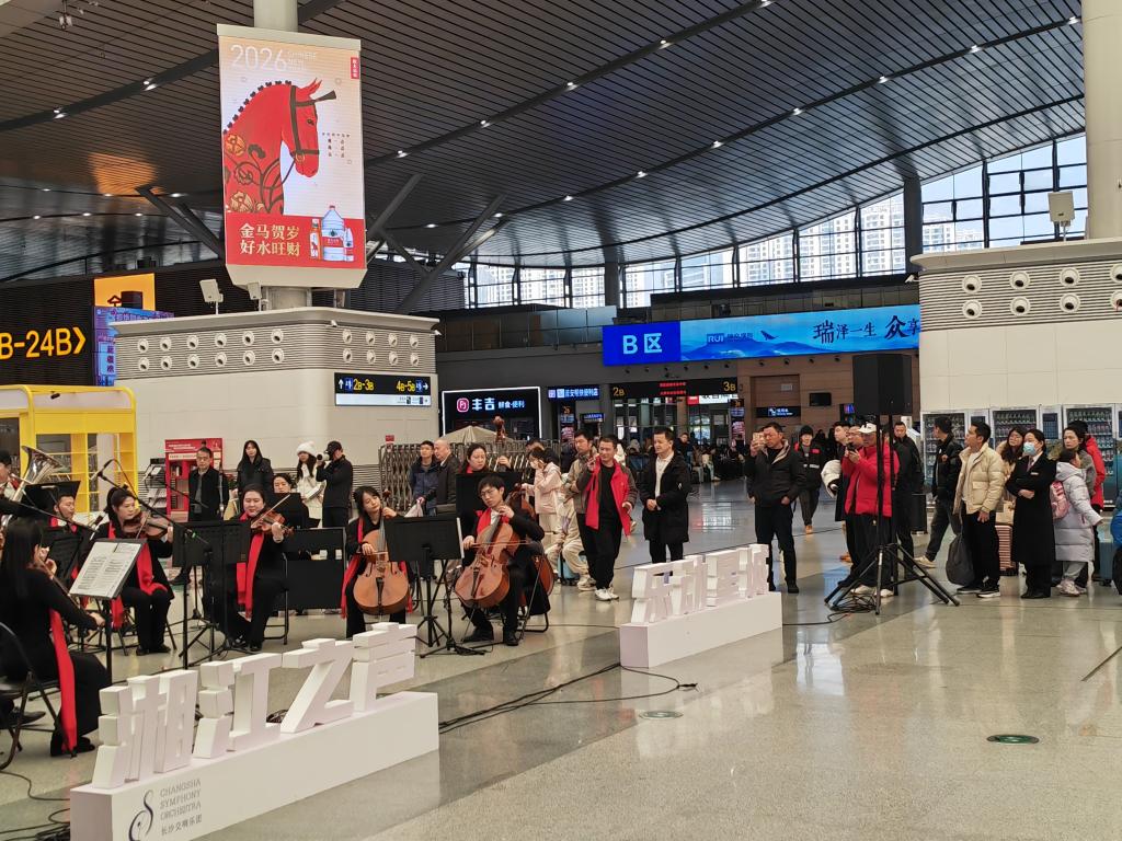 记者在广铁集团长沙南站看到,候车厅化身为“非遗游园会”,新春音乐会、非遗杂技巡游等活动轮番登场,南来北往的旅客在候车间隙沉浸式感受湖湘文化与浓郁年味。