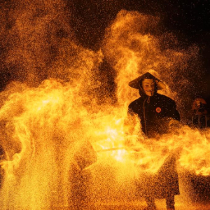 2月10日在重庆市磁器口古镇拍摄的火壶表演。