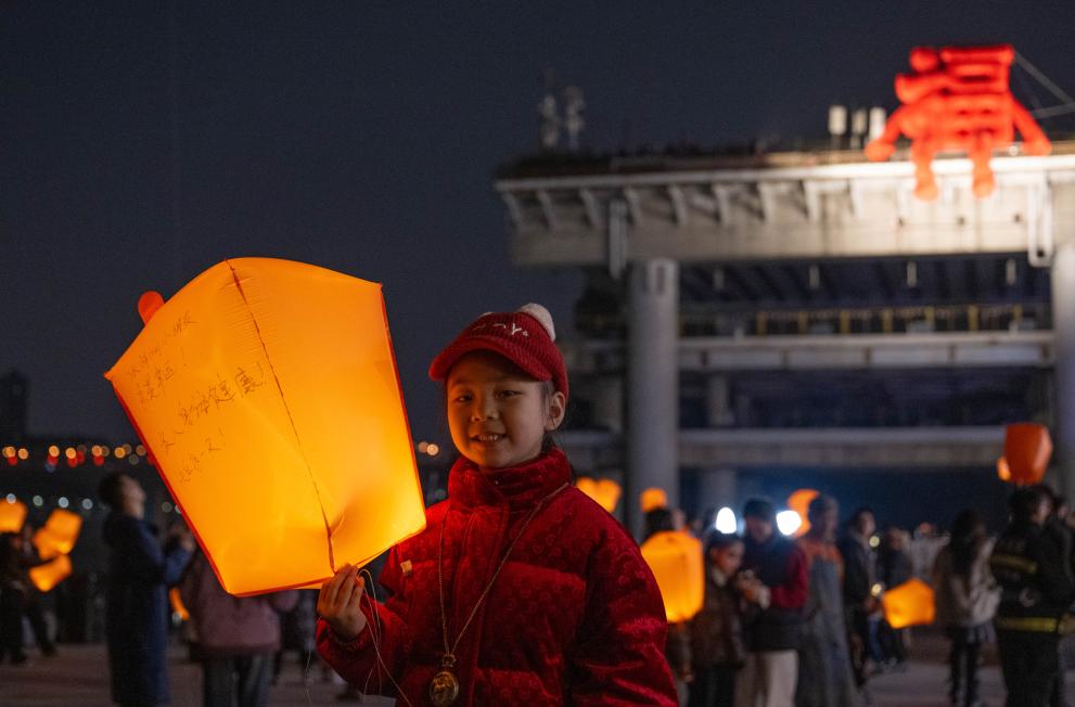 2月10日,在重庆市磁器口古镇,一名小朋友在孔明灯上写下新年愿望。