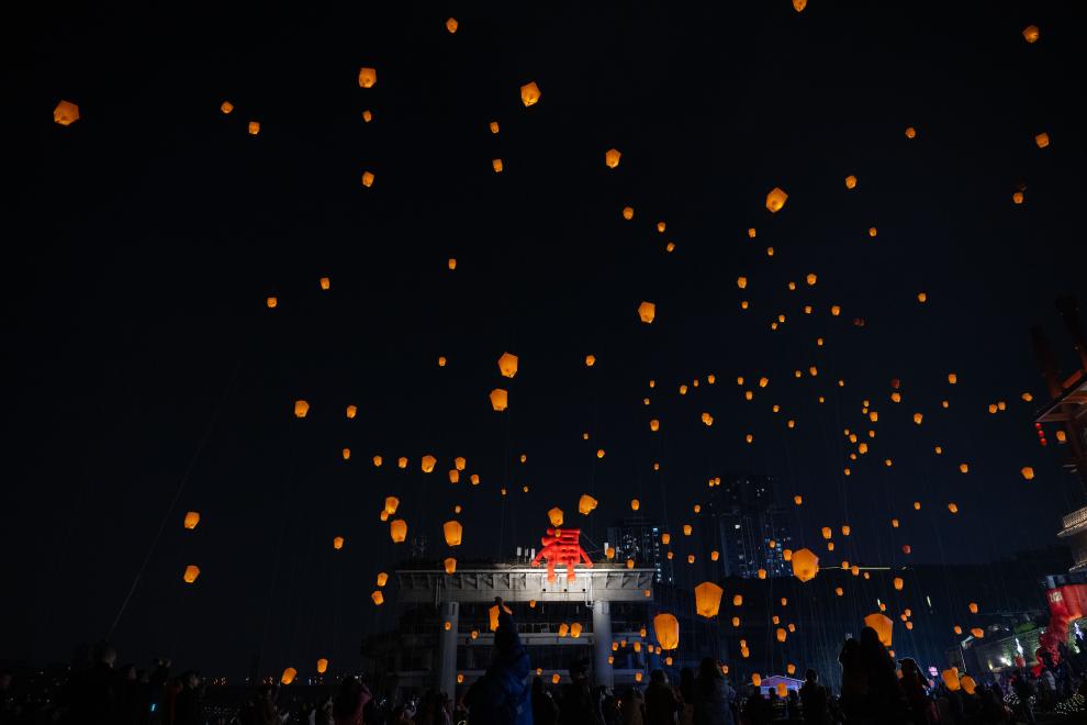 2月10日,在重庆市磁器口古镇,千盏孔明灯齐放夜空。