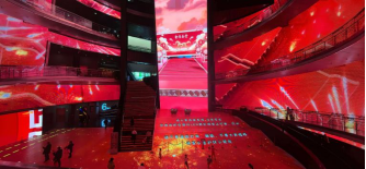 一层中央圆厅打造四屏联动主题视频,搭配漫天福袋、奔腾金马与立体“春”字装置,以瑞气升腾、骏马奔腾的意象传递新春美好寓意。