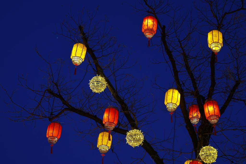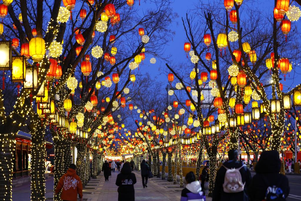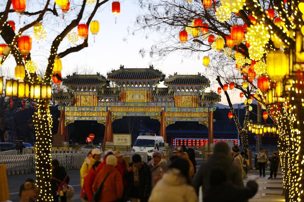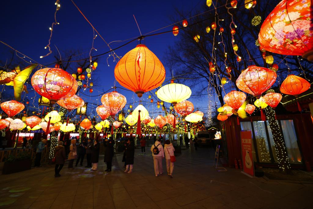 春节将至,位于北京颐和园附近的同庆街张灯结彩,一派喜庆祥和的节日景象。