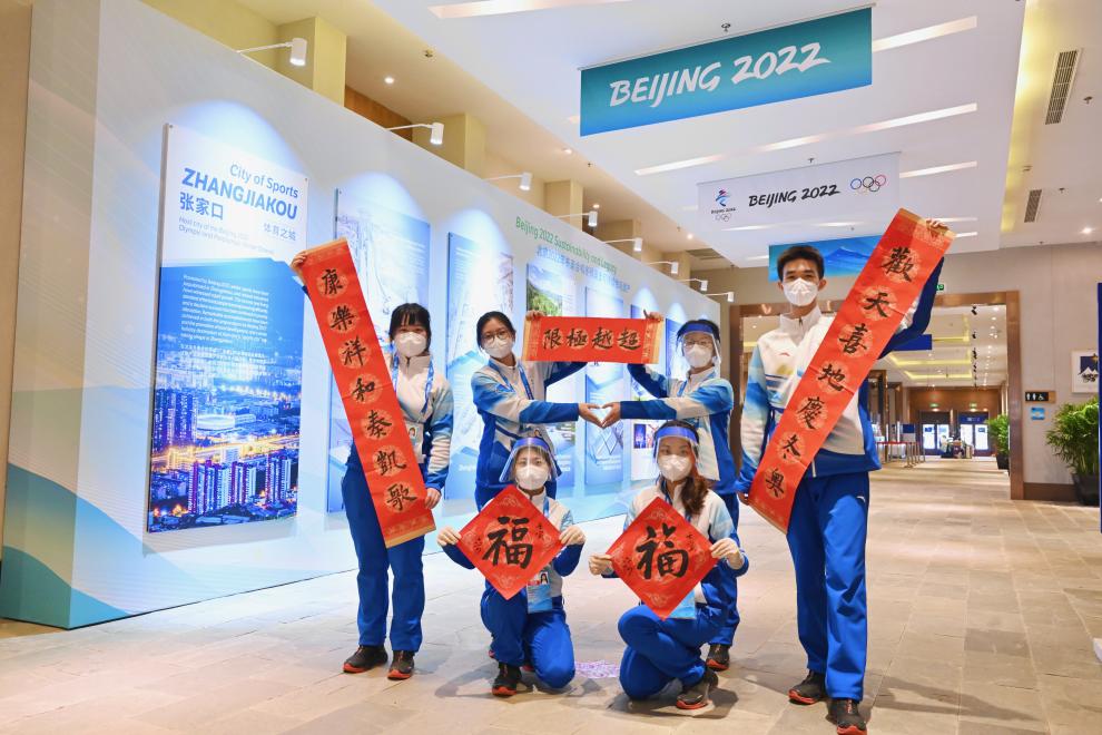 2022年1月29日,北京冬奥会张家口山地新闻中心志愿者展示春联。