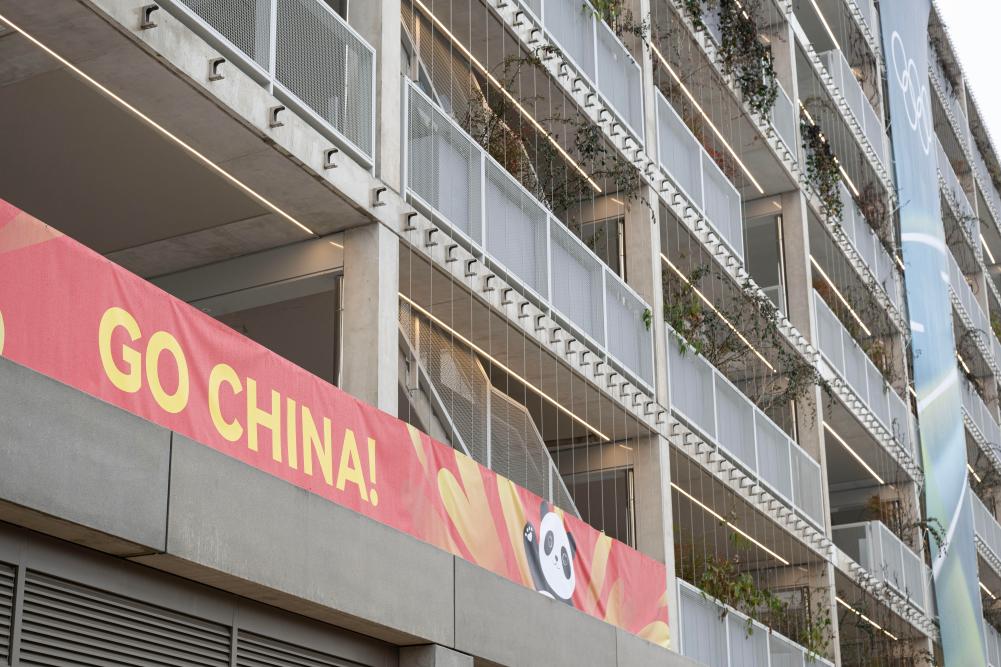 这是2026年2月3日在意大利米兰奥运村拍摄的“中国加油”横幅。