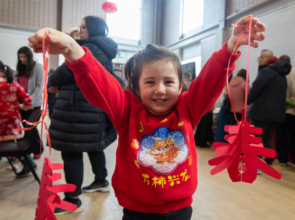 2026年2月15日,在加拿大多伦多举办的春节庙会上,一名女孩展示剪纸作品。