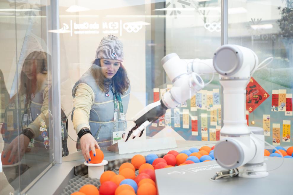 2026年2月3日,在意大利米兰奥运村,法国冰球队运动员在赞助商阿里云展台体验智能徽章交换。
