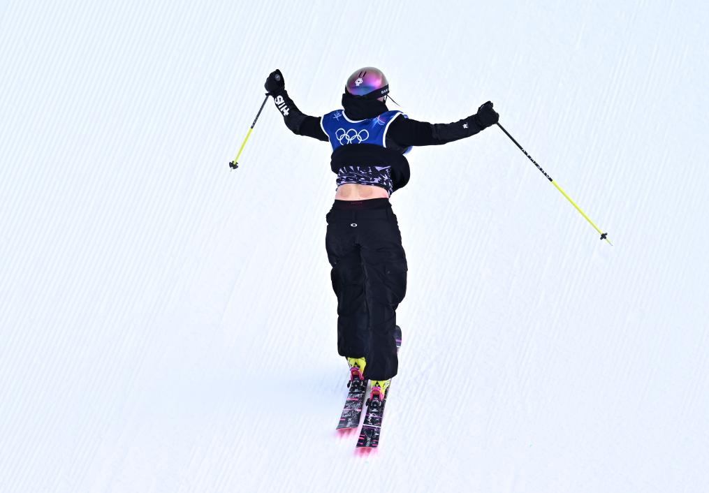 2026年2月7日,在米兰冬奥会自由式滑雪女子坡面障碍技巧资格赛中,谷爱凌在试跳后庆祝。