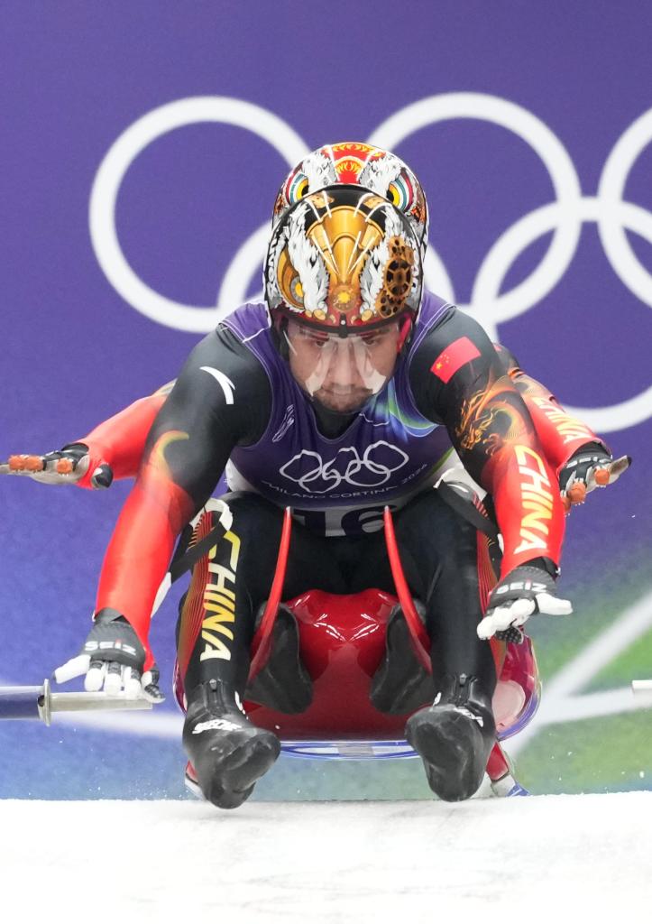 2026年2月11日,居巴依·赛克依(前)/侯硕在雪橇男子双人赛第一轮比赛中。瑞士运动员格雷莫德