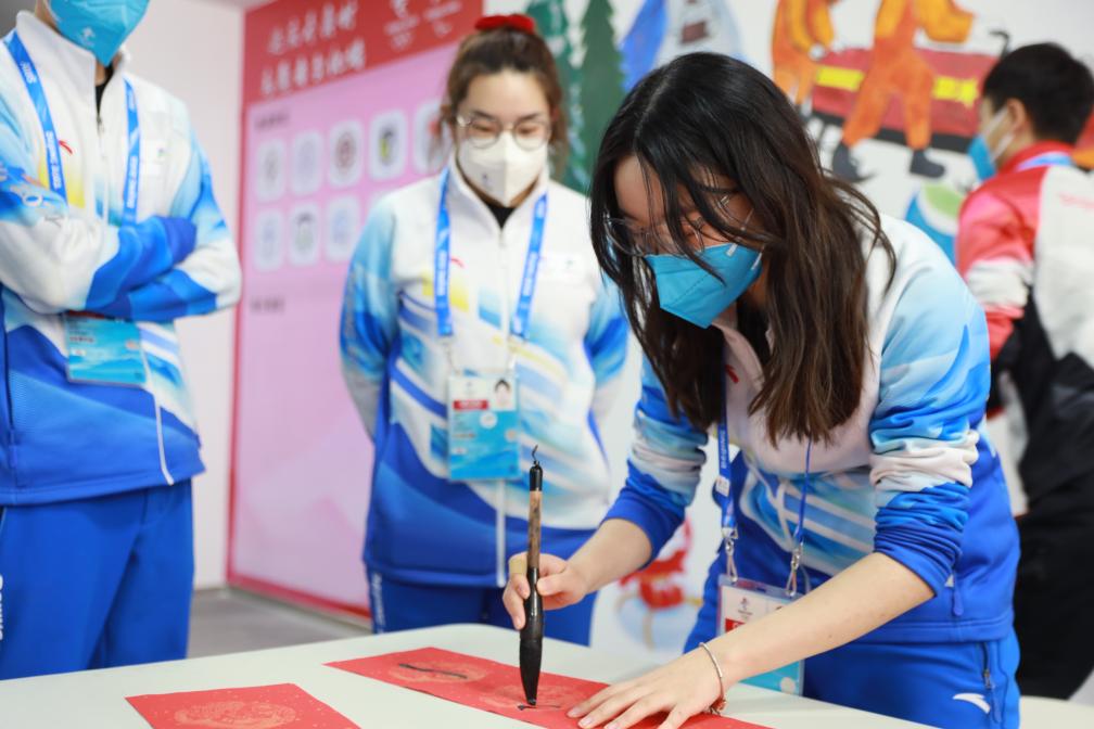 2022年1月31日, 一名志愿者在北京冬奥会延庆冬奥村书写春联。新华社发(肖绍雯摄)