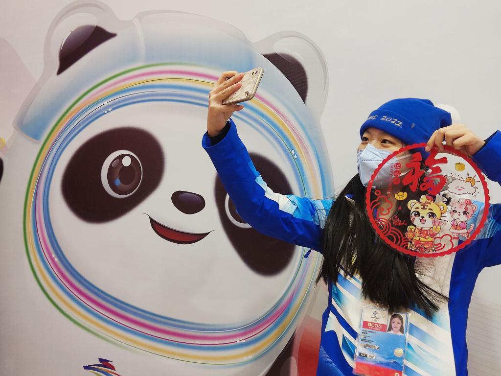 2022年1月31日,志愿者杨艳楠在北京冬奥会延庆冬奥村自拍留念。新华社发(罗敏利摄)