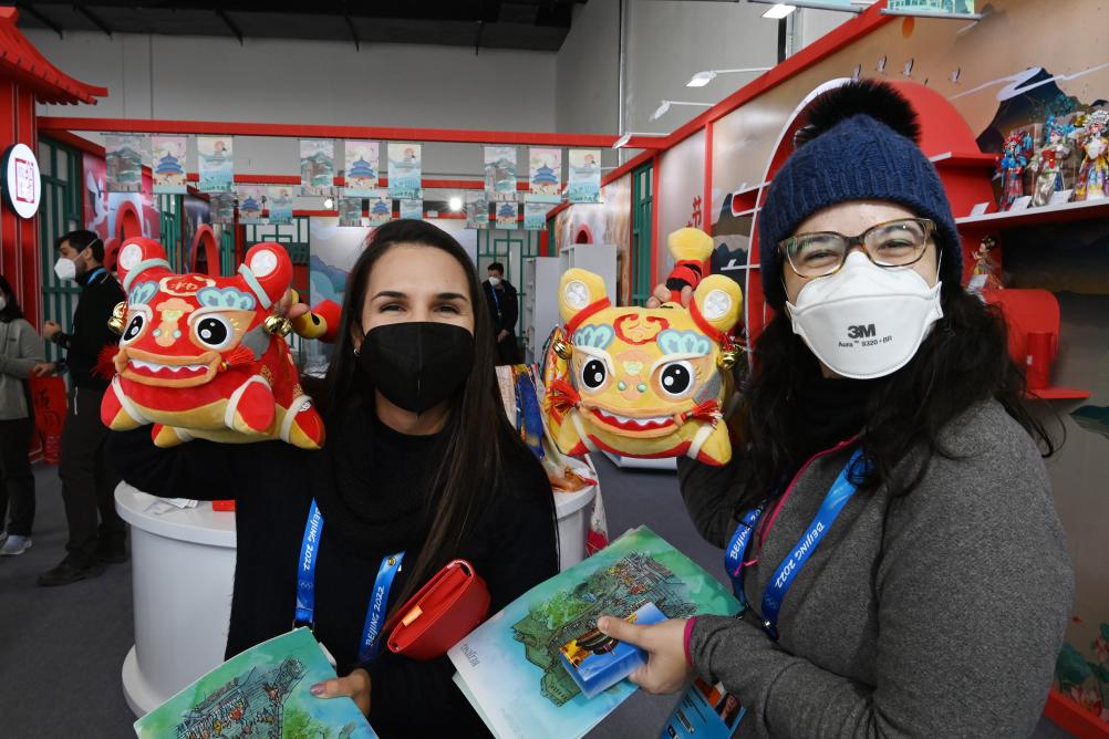 2022年1月31日,参观者在“北京故事”展厅里展示布老虎。当日,位于北京冬奥会主媒体中心二层的“北京故事”展厅举行迎新纳福民俗活动,迎接农历新年到来。