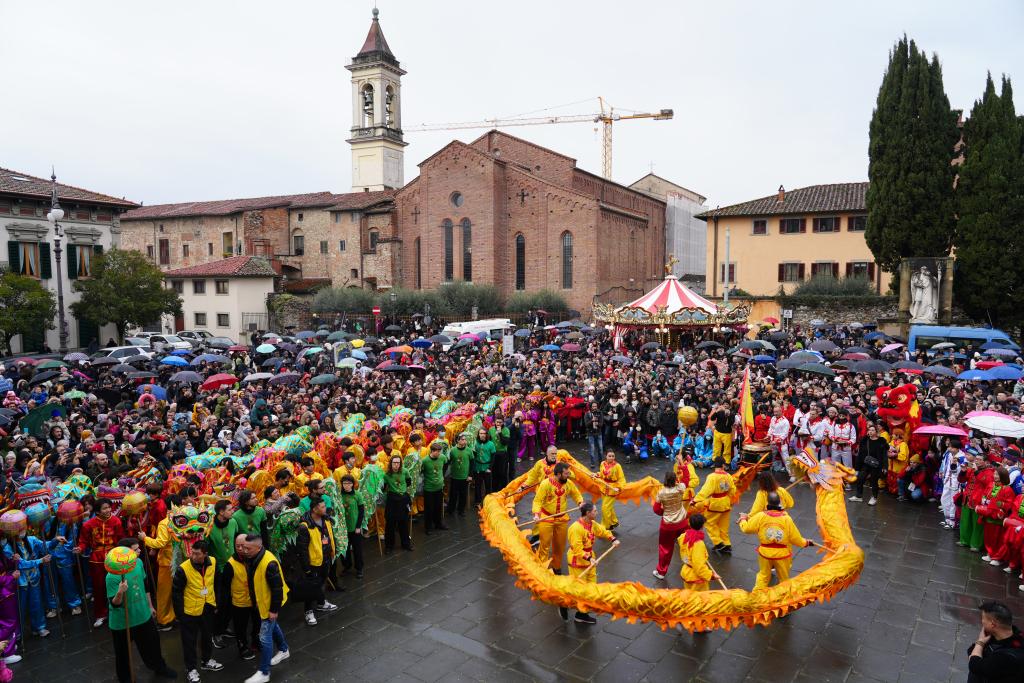 2025年2月9日,在意大利普拉托举行的巡游活动上,演员表演舞龙庆祝中国农历蛇年春节。