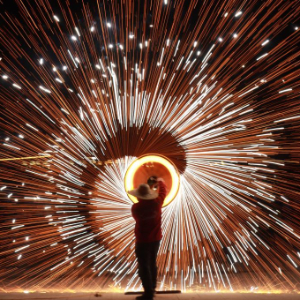 2月18日晚,在河南省安阳市内黄县文化体育中心,民间艺人表演打铁花。