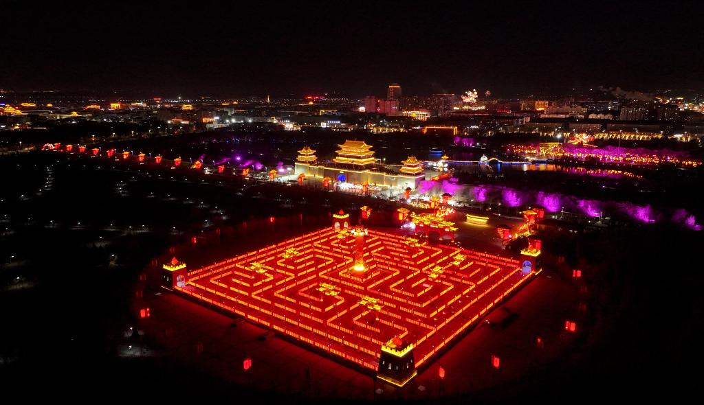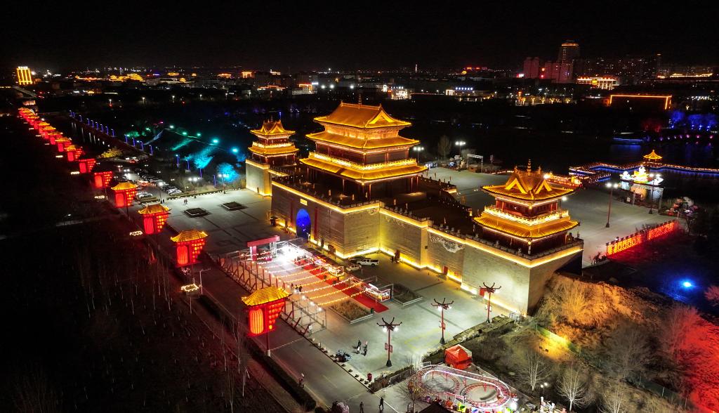 这是2月18日拍摄的宁夏盐池县九曲民俗文化园和长城关夜景(无人机照片)。