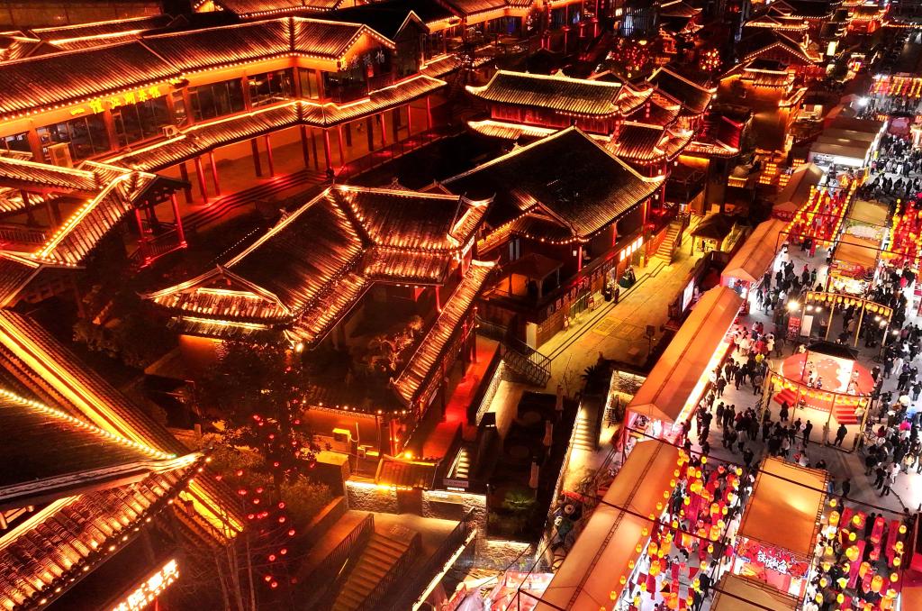 2月17日,游客在湖北省宣恩县城兴隆老街的小吃一条街上品美食(无人机照片)。