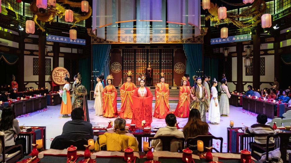 不久前,背靠龟山电视塔的知音殿启动试运营。相传,三国时期东吴名将鲁肃曾在此驻守。千百年岁月流转,今人沿着石阶走进知音殿,仿佛穿越至三国烽火岁月。沉浸式餐剧秀《三国群芳宴》在这里上演,经典人物依次登台,主创团队融合古典歌舞与现代演绎手法,创新再现三国故事,观众既能参与互动,又能品尝荆楚美食。
