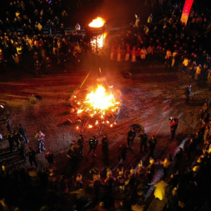 3月3日,在甘肃省陇南市文县铁楼藏族乡草河坝村,当地群众和游客一起跳火圈舞(无人机照片)。新华社记者 范培珅 摄