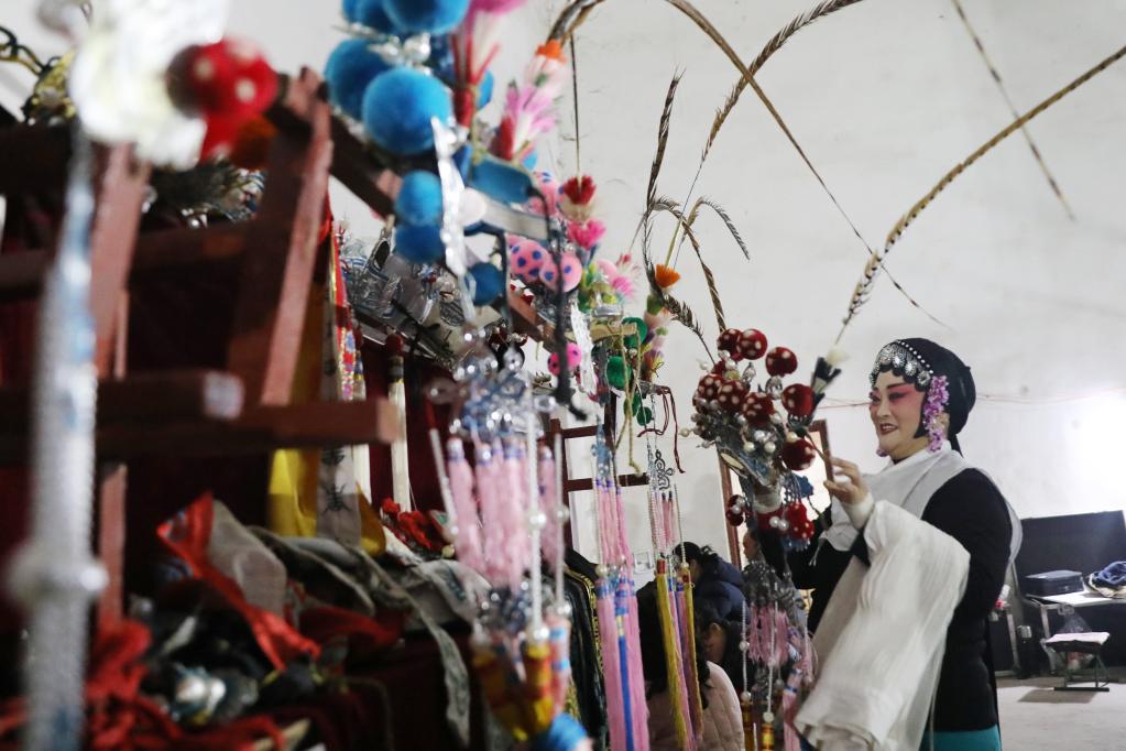 3月7日,演员在河南省焦作市温县武德镇村文化中心候场时整理道具。