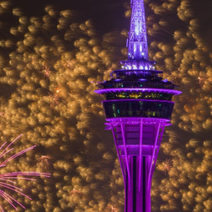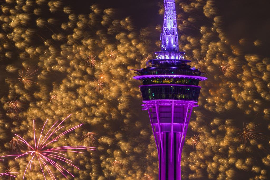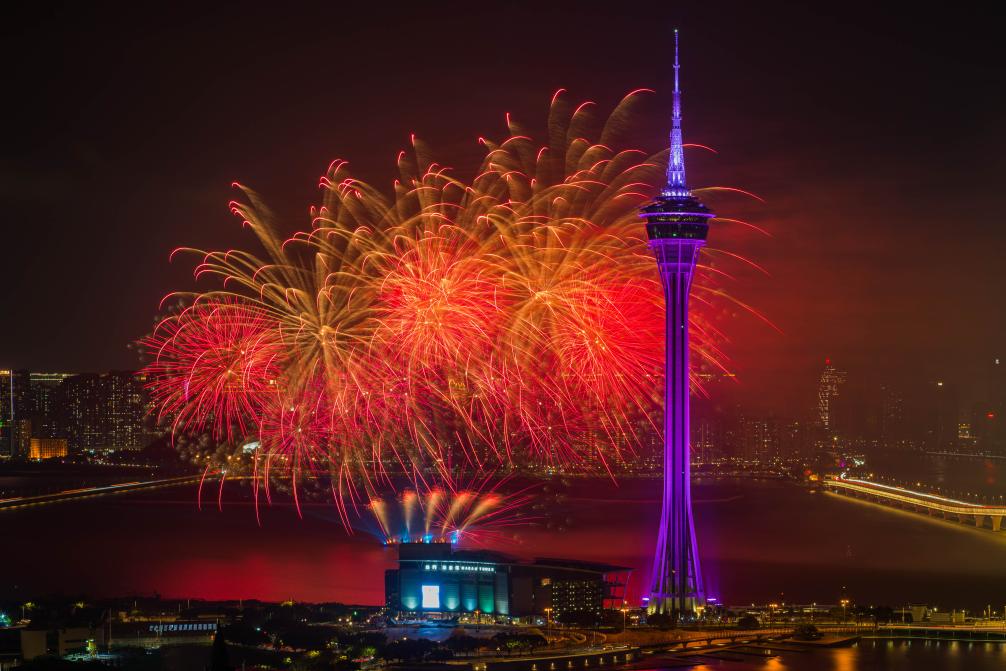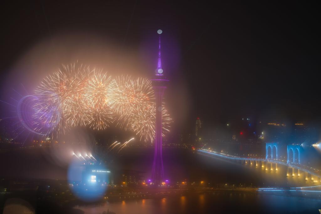 3月7日,澳门旅游局在澳门旅游塔对出海面举行“金骏云翔 欢乐春节”2026无人机烟花汇演第三场。