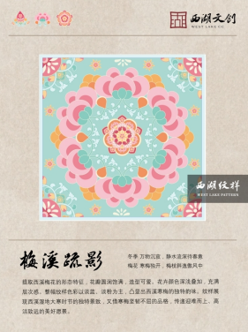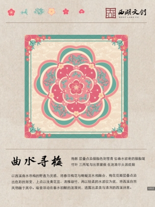 形态基因:从曲水寻梅的野逸、寒梅傲雪的坚韧中,撷取灵感——花瓣圆润饱满,色彩层叠晕染,以简练而富有张力的线条勾勒出梅花的轻盈柔美,将初春江南的灵动气息凝于纹样之间。