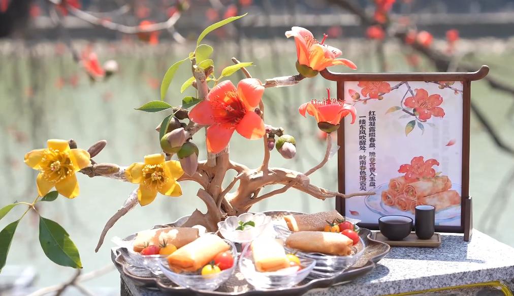 时下的粤港澳大湾区也正是满城繁花的时节。美食、非遗文创等多种业态与春日花卉深度融合,成为拉动消费的新增长点。在广东佛山,粤菜师傅以“金银棉棉”“聚财神舟”等创意美食,打造春天里的“特色花宴”。佛山市顺德区勒北村厨师吴叶崧向记者介绍了一道菜式“红棉卷春”,“味道外脆里嫩,外面是用春卷皮,里面是用木棉花,配合时蔬制作而成。”