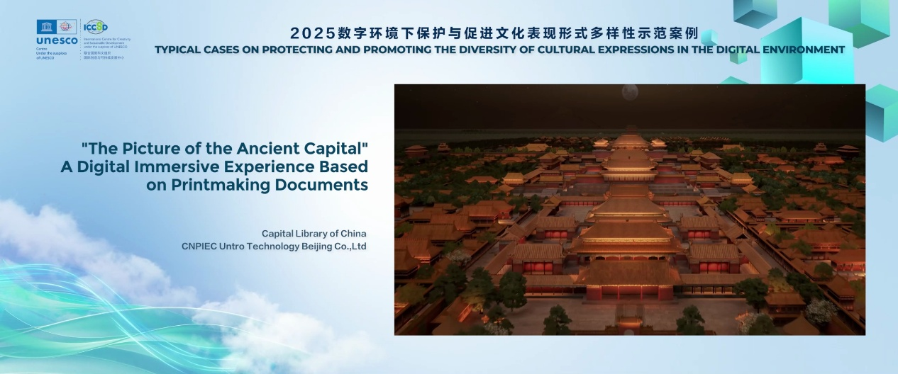 3月27日,2025数字环境下保护与促进文化表现形式多样性示范案例在第五届创意2030国际论坛上正式发布。首都图书馆与中图云创智能科技(北京)有限公司联合打造的“《古都图景》:基于版画文献的数字沉浸体验”项目入选示范案例。