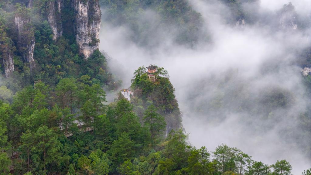 ↑2026年4月1日在贵州省黔东南苗族侗族自治州施秉县云台山景区拍摄的云雾景观。(无人机照片)CICPHOTO/磨桂宾 摄