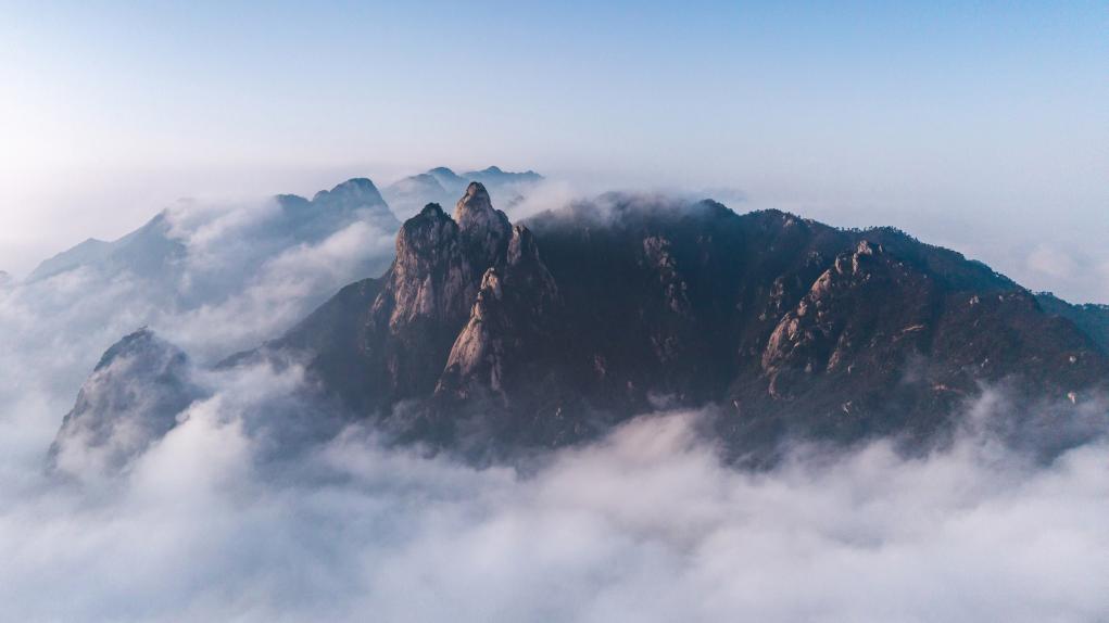 ↑2026年3月7日在安徽省池州市九华山风景区拍摄的云雾景观。(无人机照片)CICPHOTO/李智宏 摄