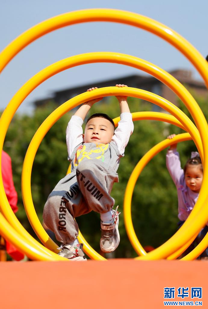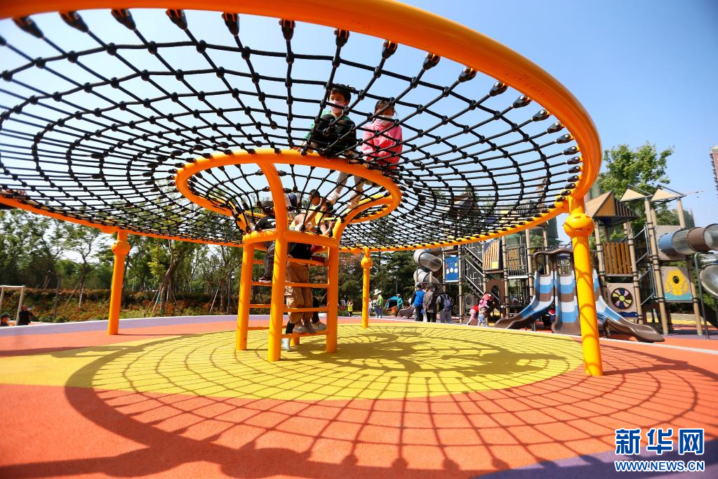 5月15日,小朋友在山东省青岛市即墨区一处“口袋公园”玩耍。