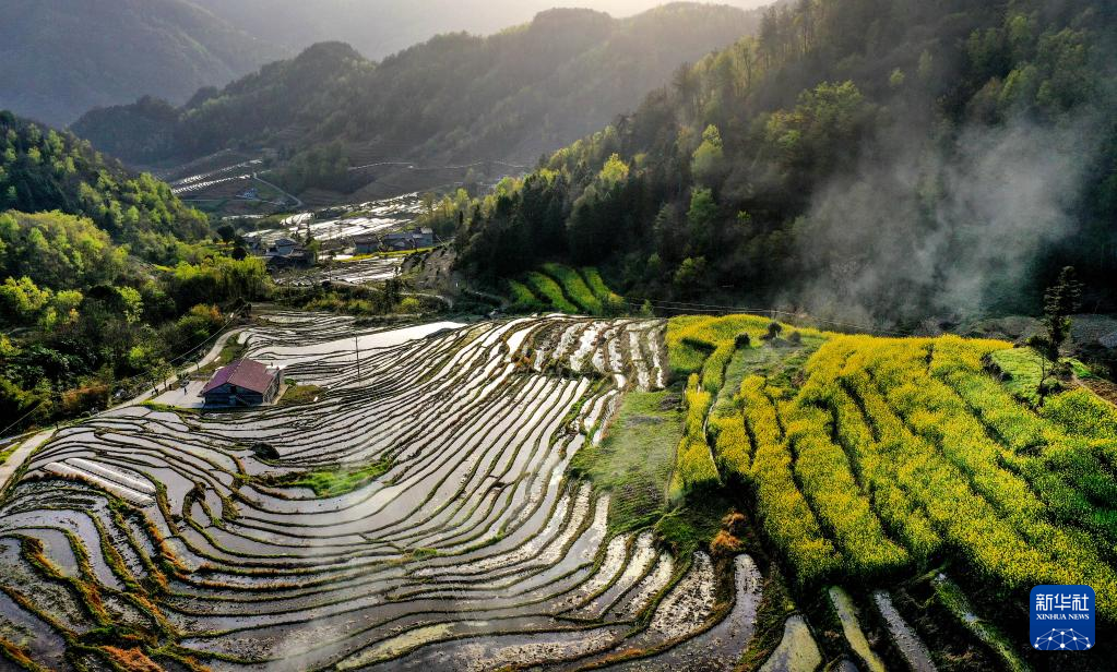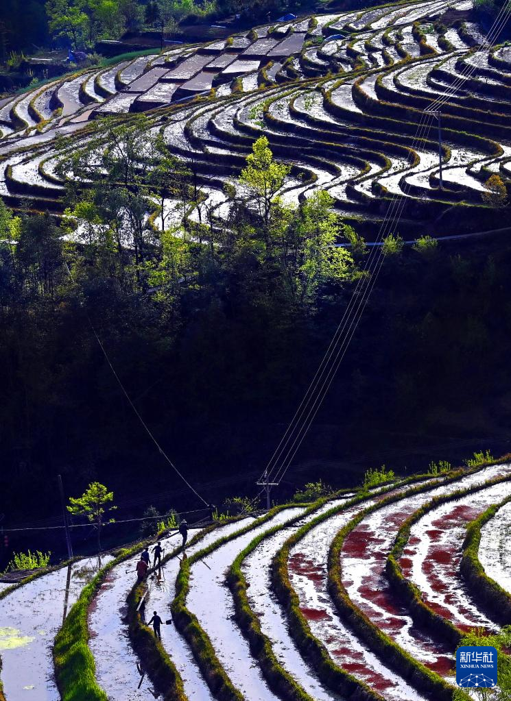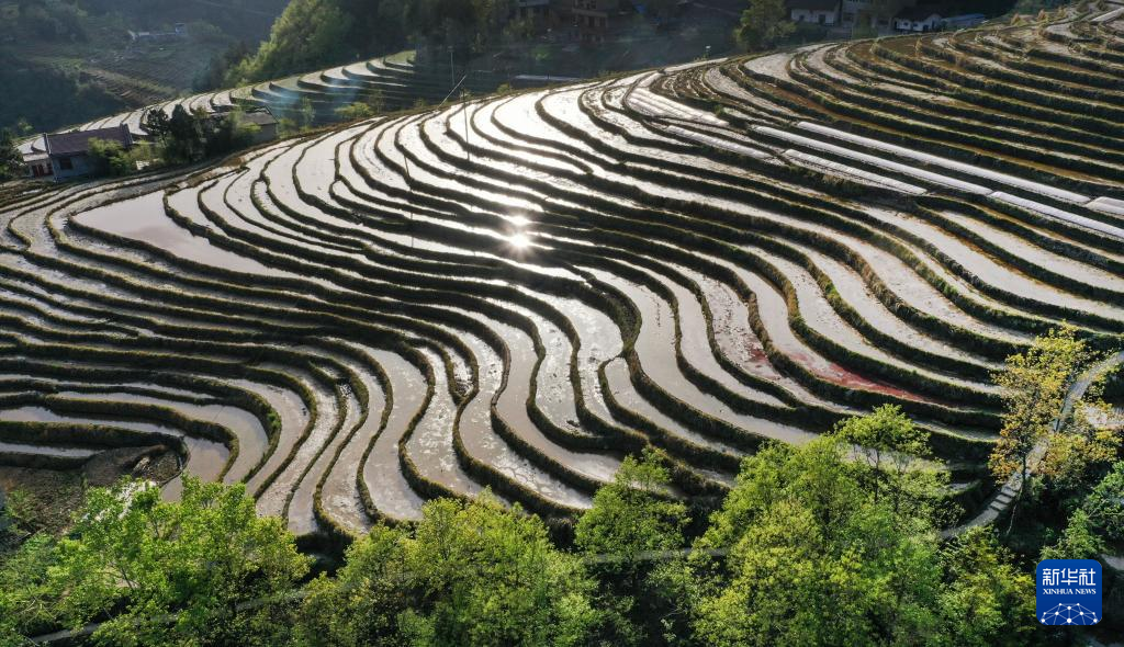 近日,在陕西省安康市岚皋县南宫山镇桂花村,因春灌备耕,沿山势自上而下层层铺叠的千亩梯田,仿佛戴上了一串串银链,构成了一幅优美的田园风光图。