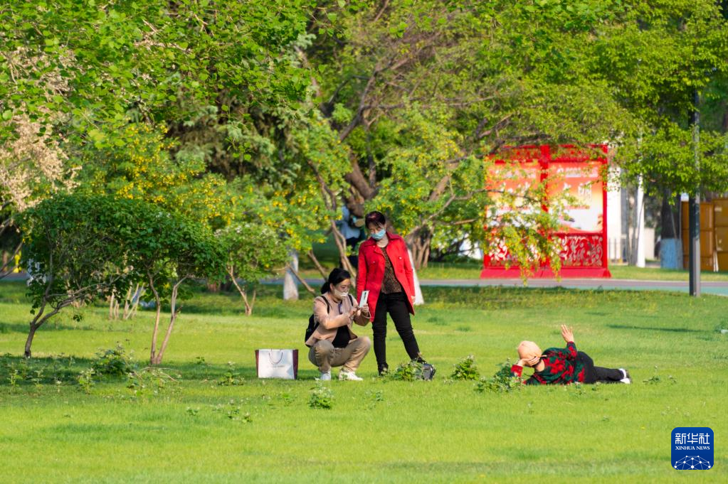 5月19日,市民在哈尔滨市香坊区一公园游玩拍照。