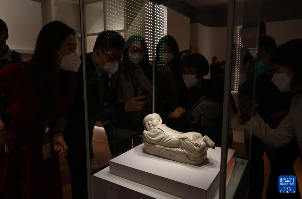 这是即将展出的北宋定窑白釉孩儿枕(6月9日摄)。