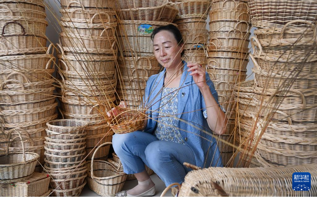 6月21日,袁家圪堵村社区工厂的村民在加工柳编产品。