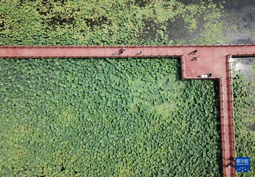 6月21日,在山东省曹县黄河故道国家湿地公园,游客观赏荷花(无人机照片)。