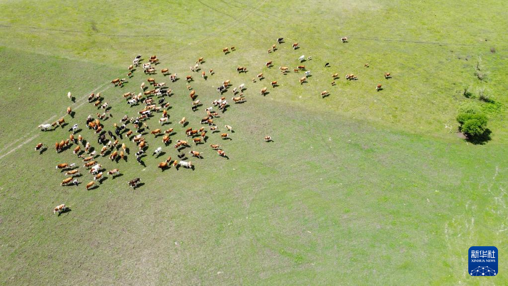 6月26日在内蒙古呼伦贝尔市新巴尔虎左旗古日班赛罕夏营地拍摄的牛群(无人机照片)。