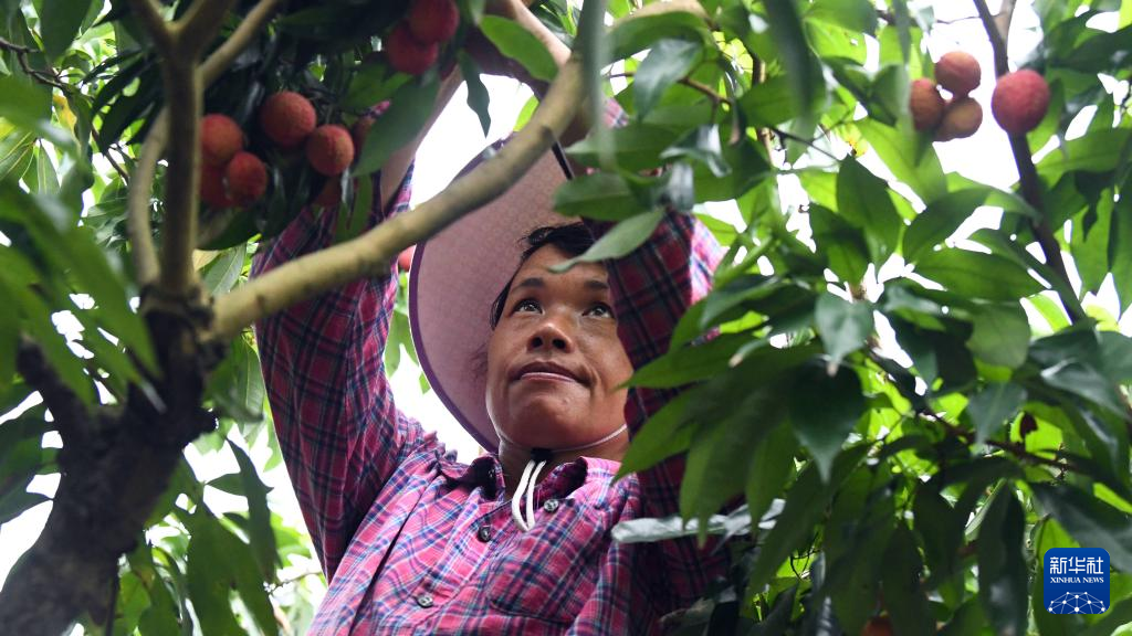6月29日,在广西钦州市钦南区沙埠镇杨梅村荔枝园,一名村民在采摘荔枝。