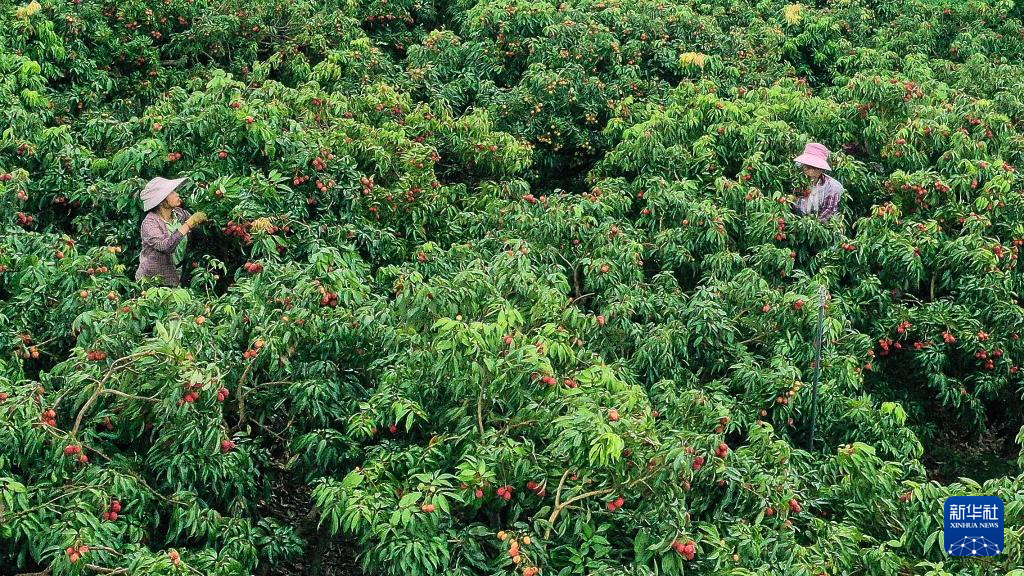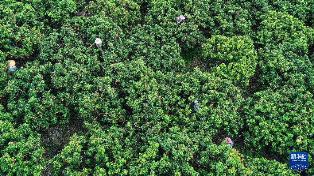 在广西钦州市钦南区沙埠镇杨梅村荔枝园,村民在抢收荔枝(6月29日摄,无人机照片)。