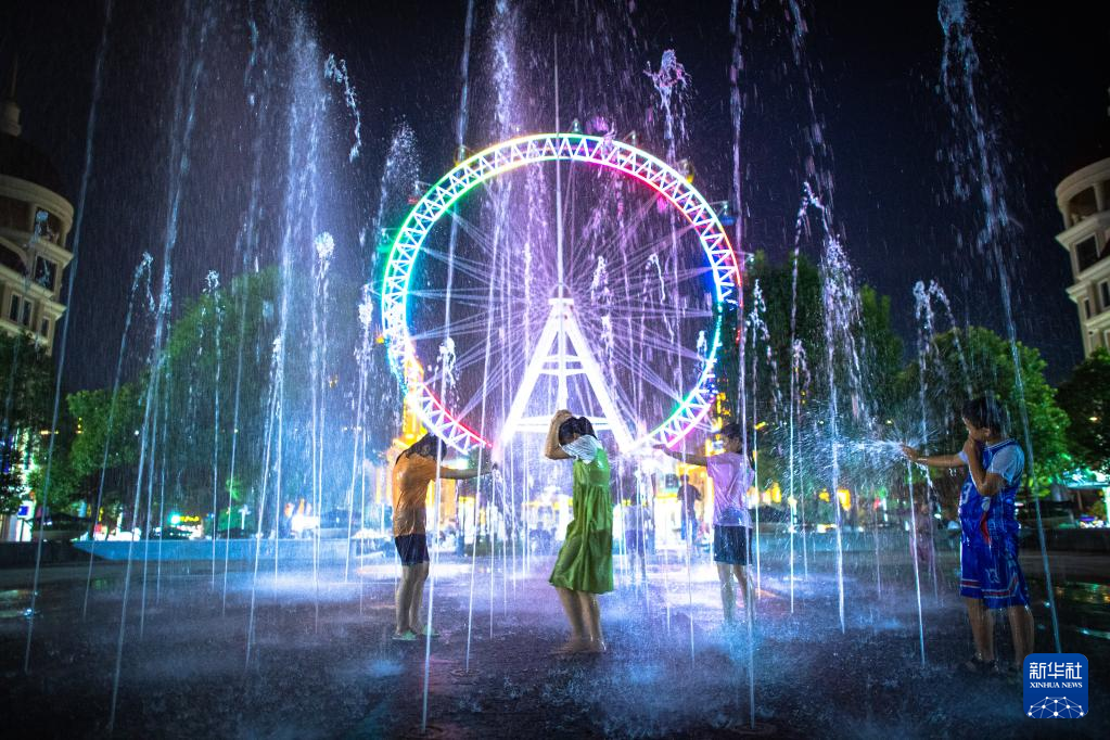 7月2日,小朋友在武汉汉口北夜市的喷泉边玩耍。