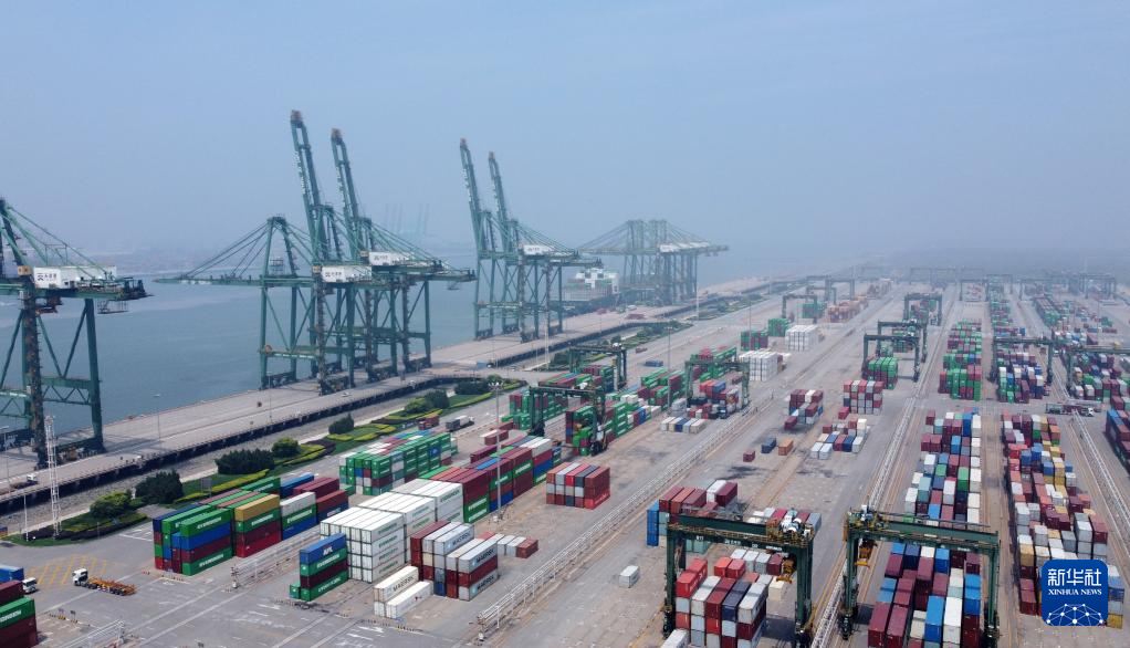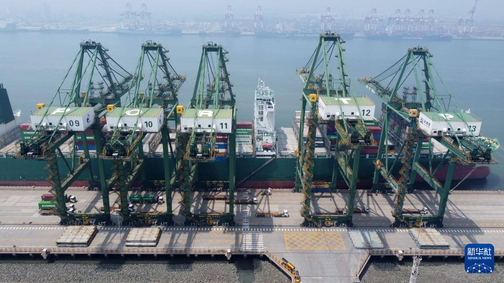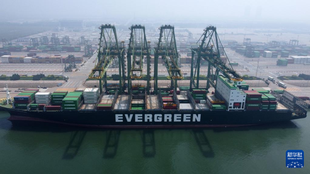 7月14日,一艘货轮停靠在天津港太平洋国际集装箱码头(无人机照片)。