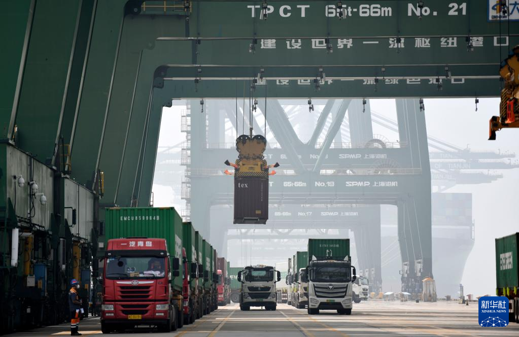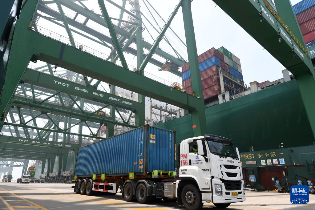 7月14日,卡车在天津港太平洋国际集装箱码头运输集装箱。