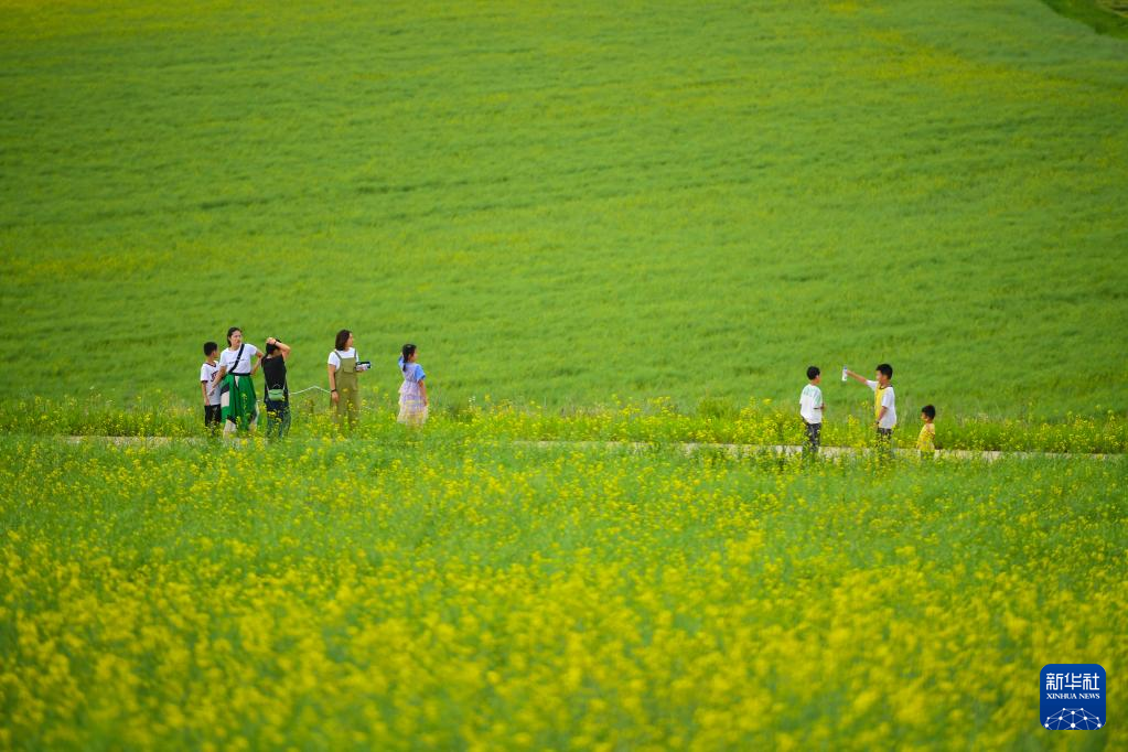 7月26日,游客在额尔古纳市蒙兀室韦苏木的油菜花田间游玩。