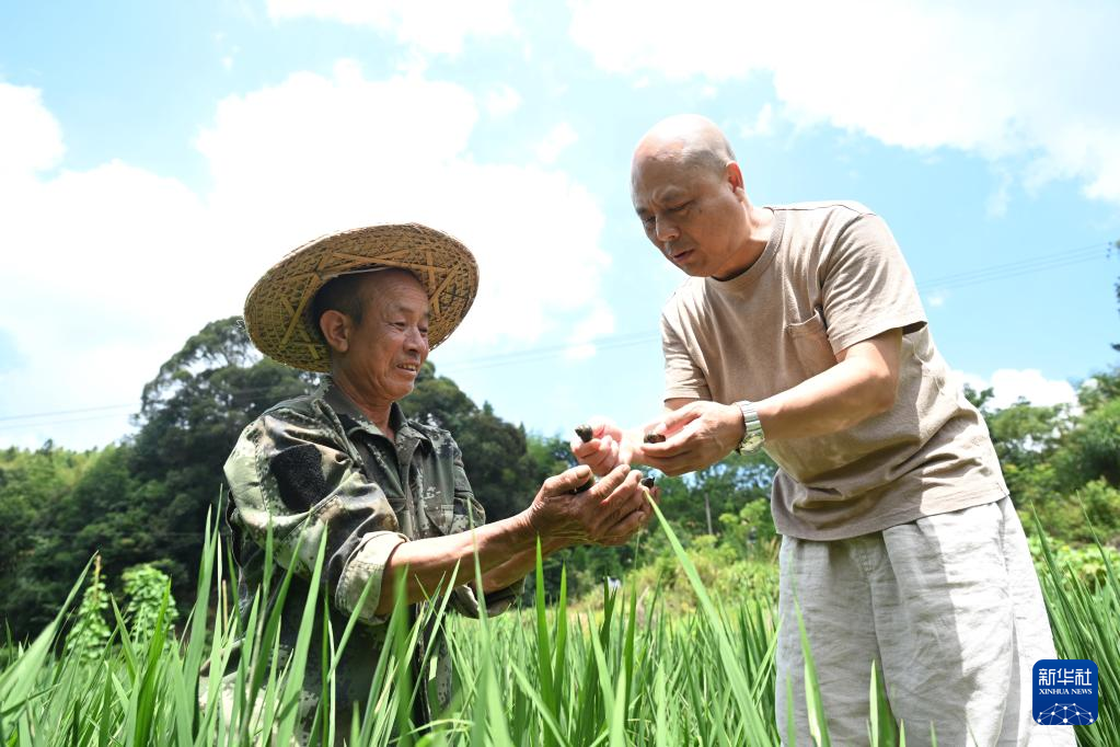 8月9日,农业推广研究员练进旺(右)在迪口镇店村村一处稻螺种养田指导农民郑智富采收田螺。